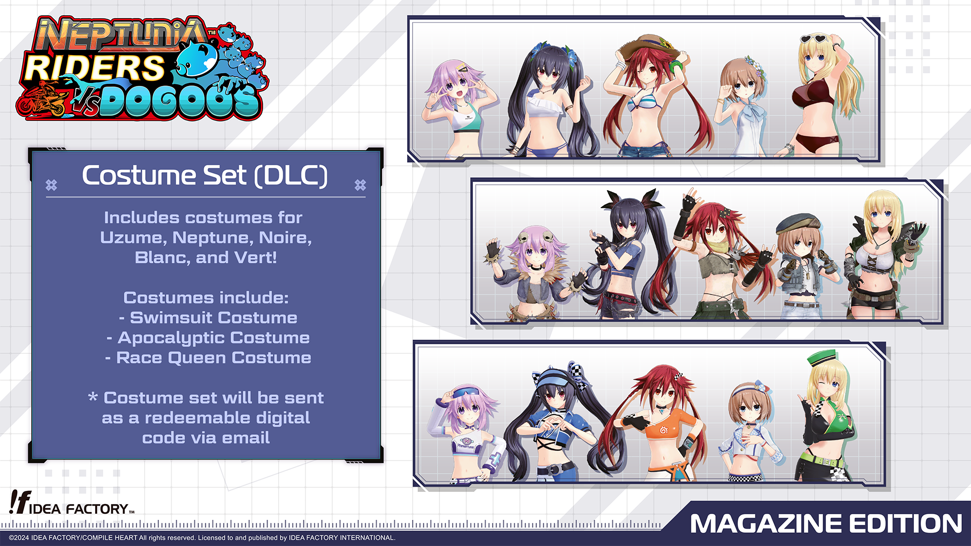 - Download code for the Neptunia Riders VS Dogoos Costume Set* (1x costume per set for Uzume Neptune, Noire, Blanc, Vert, 15x total)