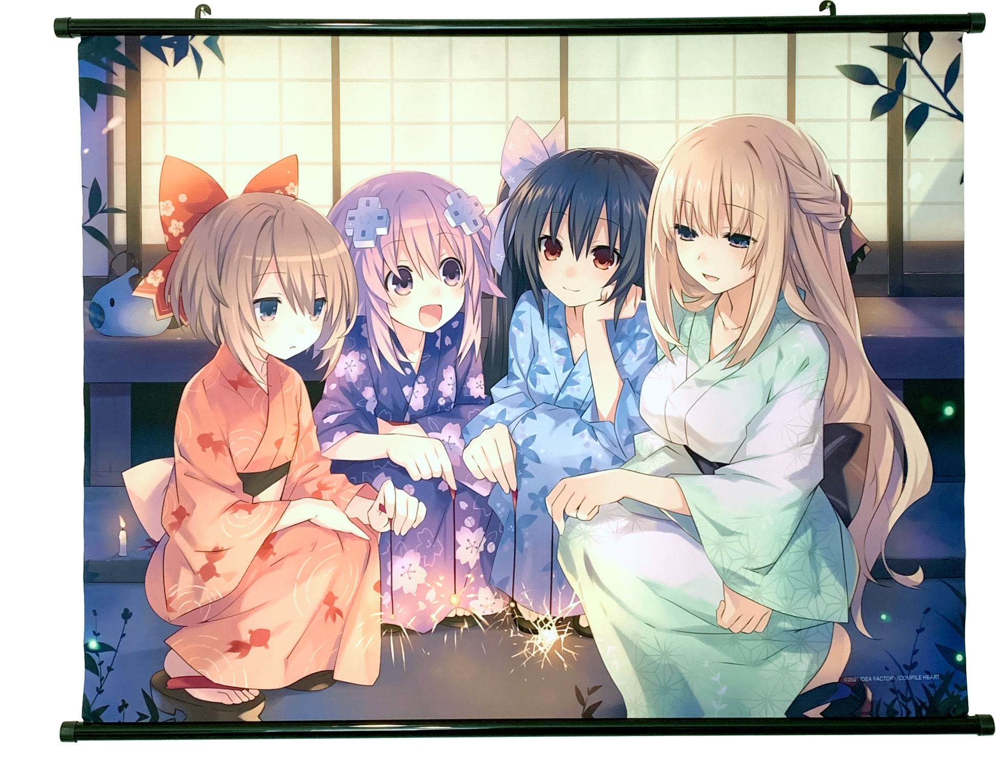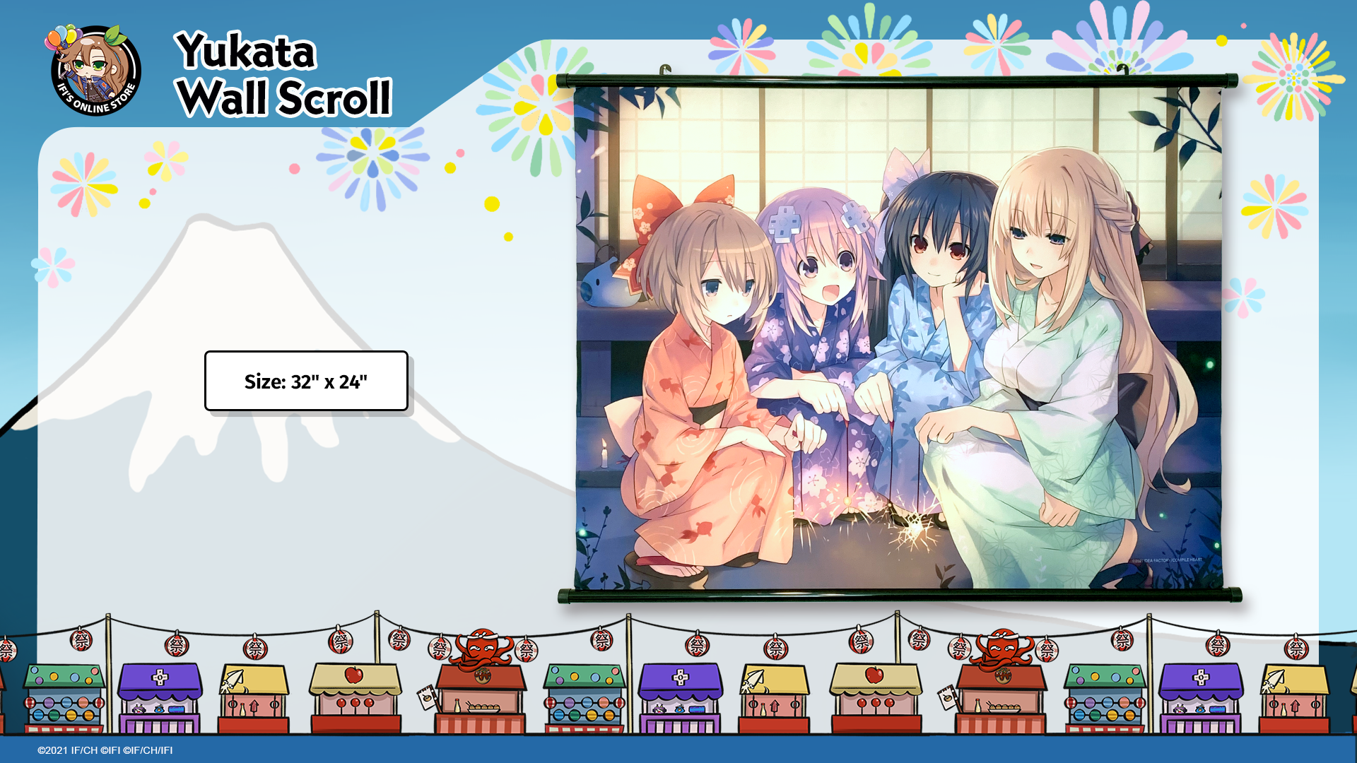 The music is loud, the lights are plenty, and the smell of okonomiyaki wafts through the air. It's festival time, and the Goddesses are dressed to celebrate with sparklers in hand! You can join the celebration too with the Yukata Wall Scroll.